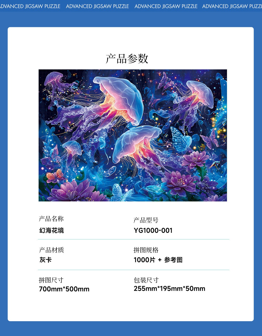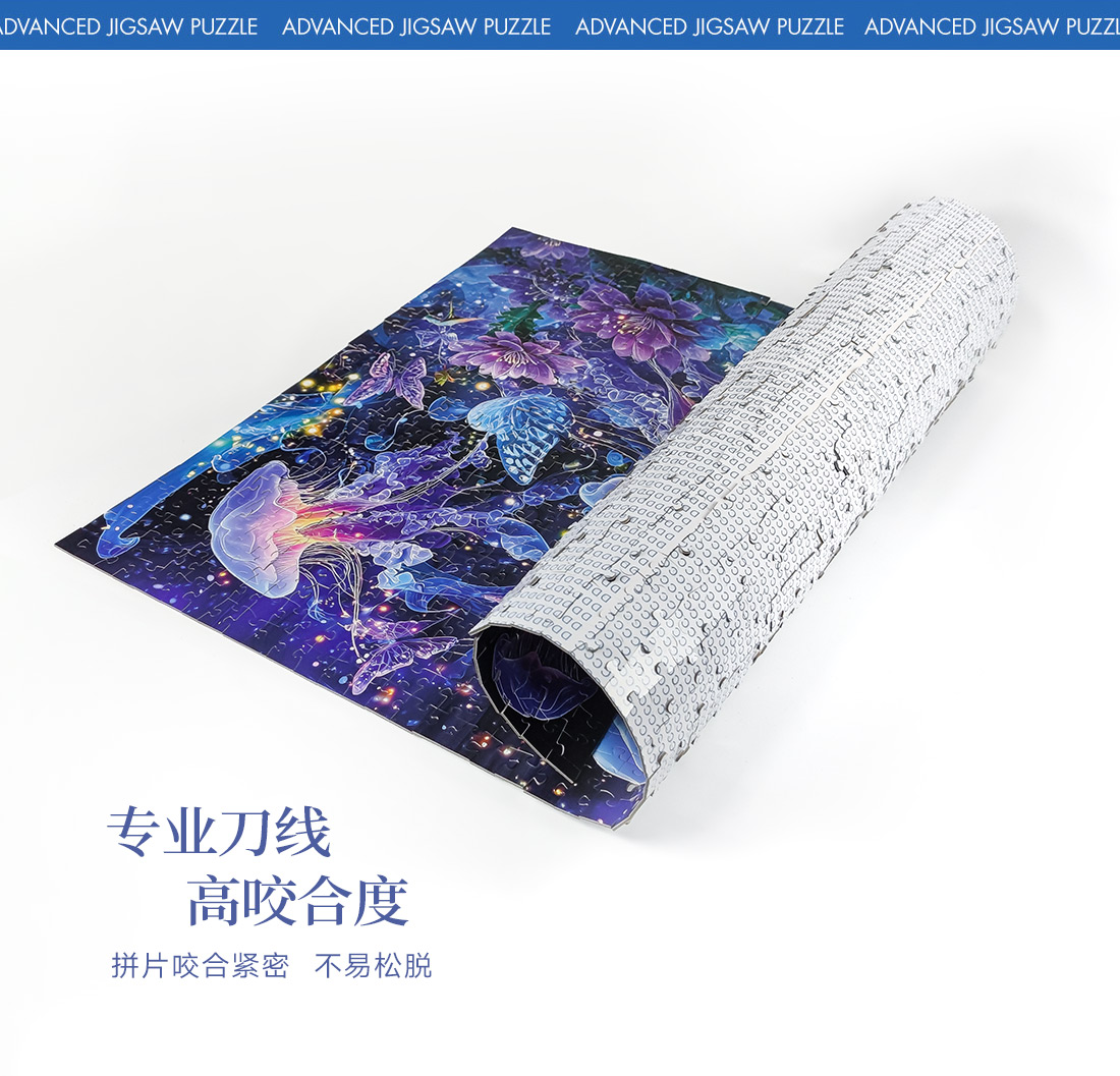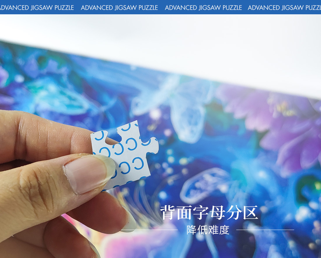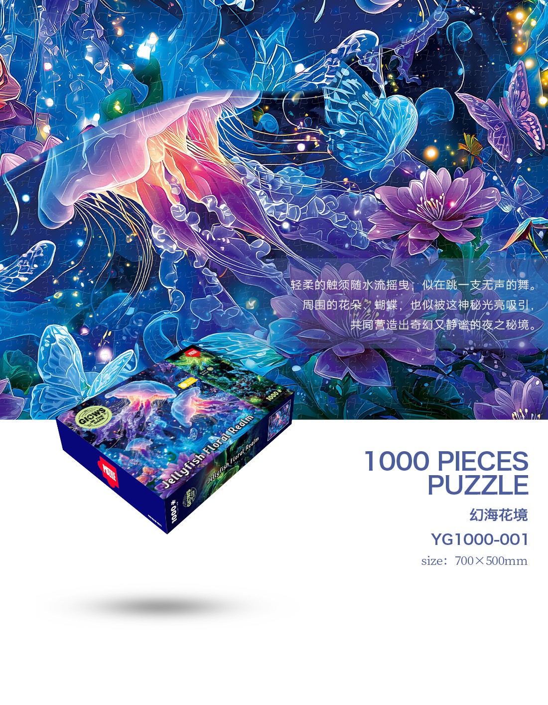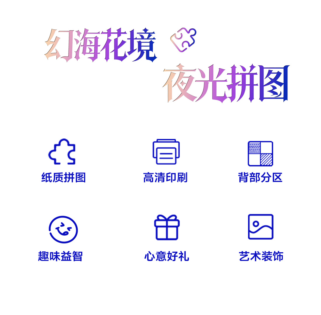拼圖名稱:【幻海花境】夜光拼圖 拼圖尺寸:700*500MM 拼圖材質:紙質灰卡 拼圖片數:1000片 加工方式:廠規、來圖定制 包裝尺寸:180*130*50mm