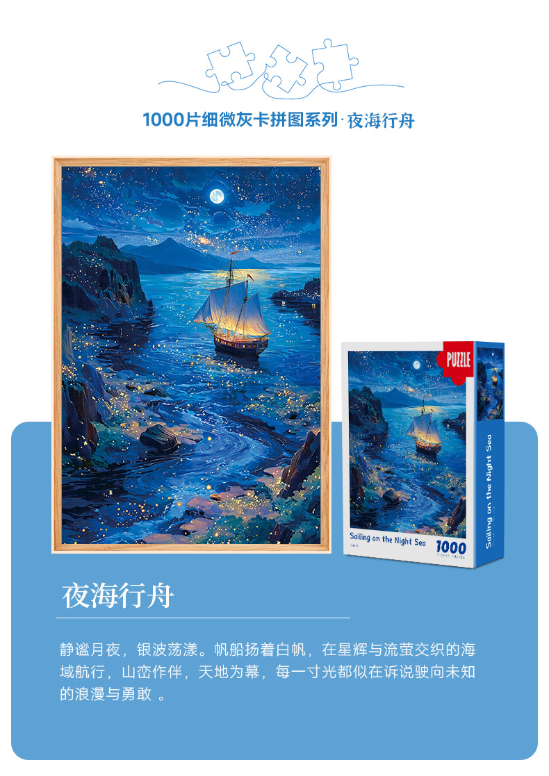 拼圖名稱:夜海行舟66-050 拼圖尺寸:380*260MM 拼圖片數:細微灰卡1000片 加工方式:廠規、來圖定制 包裝尺寸:180*130*50mm