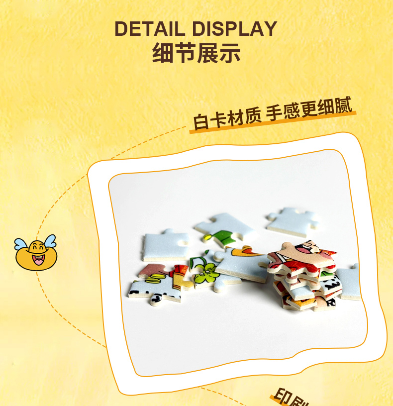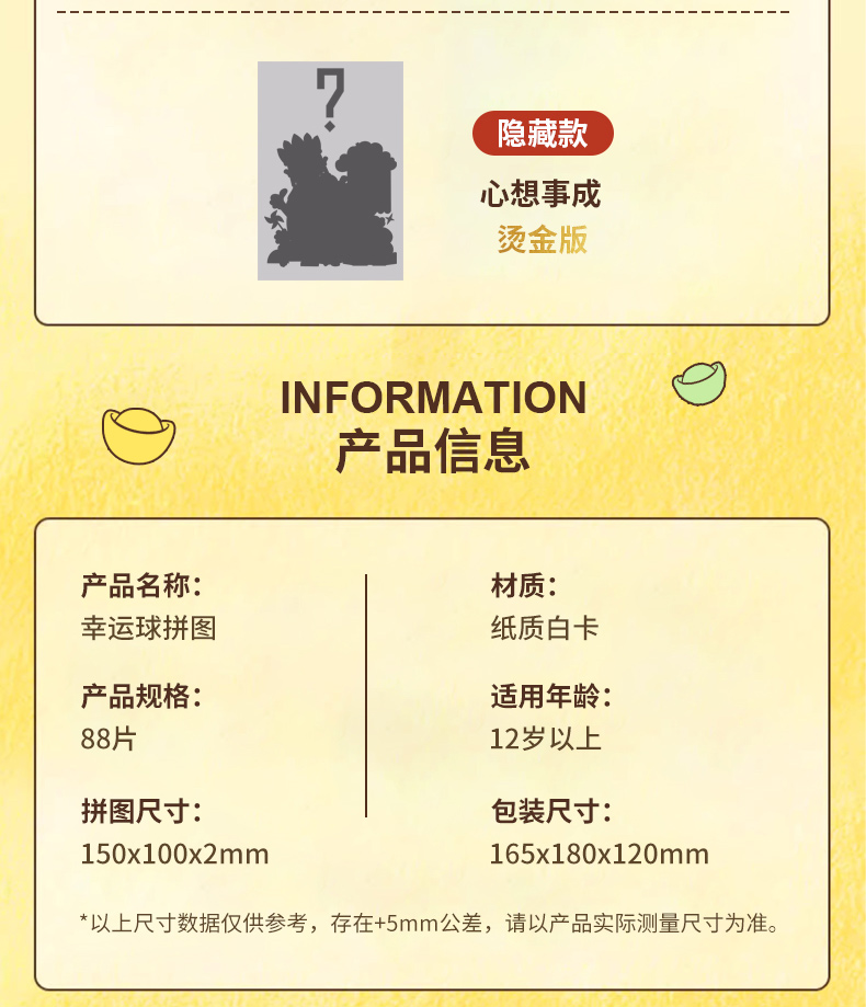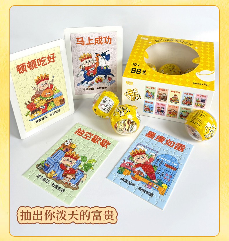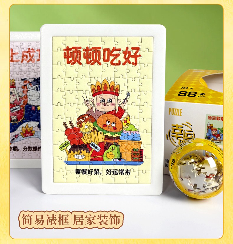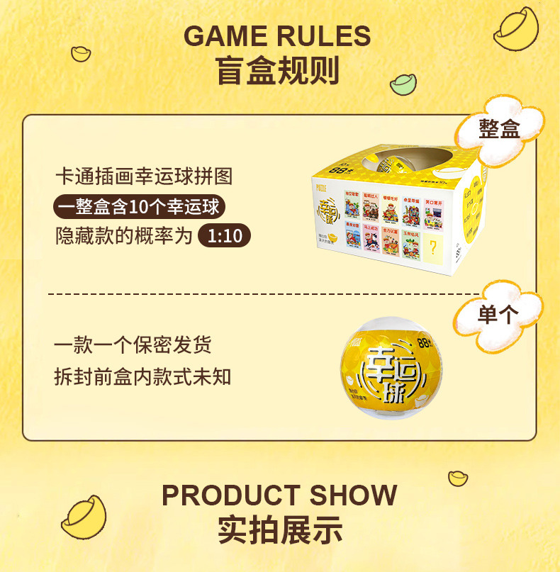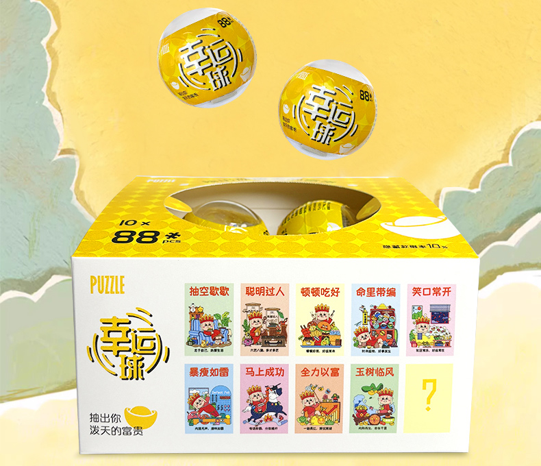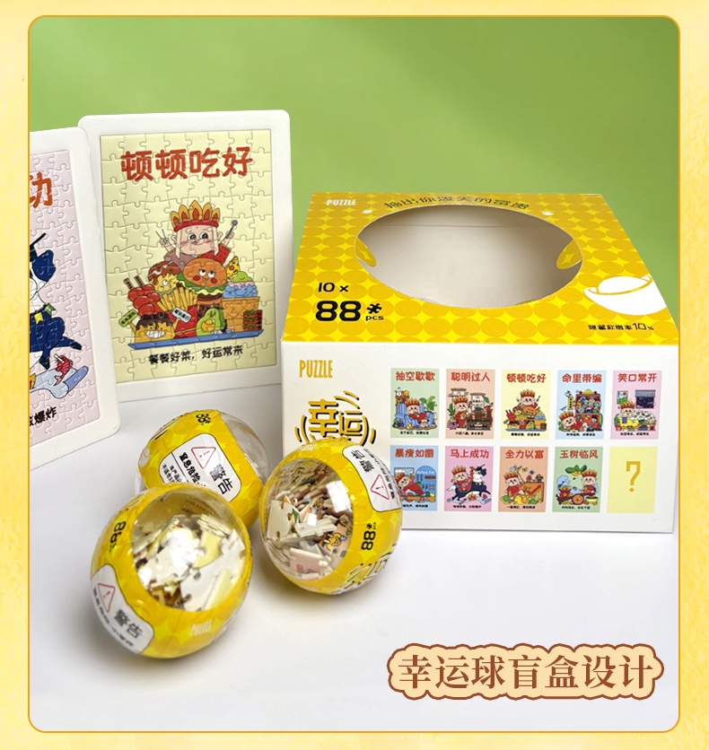 產品名稱:幸運球拼圖盲盒 產品片數:88片 產品材質:紙質白卡紙 產品尺寸:100*150*2.0MM 包裝尺寸:165*180*120mm